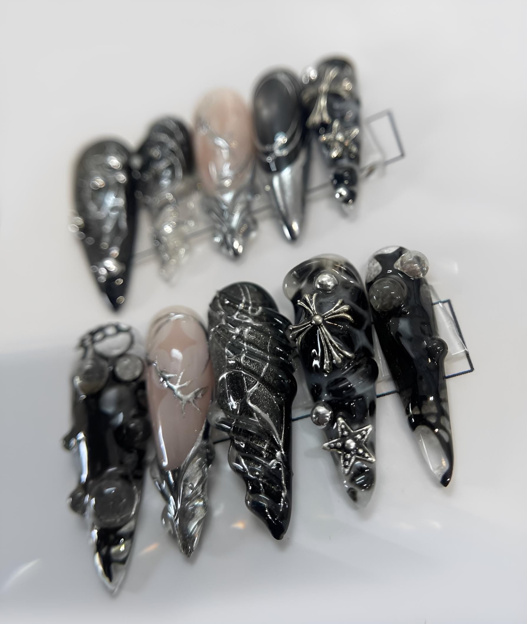 Black Silver Chrome Press On Nails Gothic False Nails 3D Cross Star Glue On Nails Edgy Punk Rock Nail Art Set