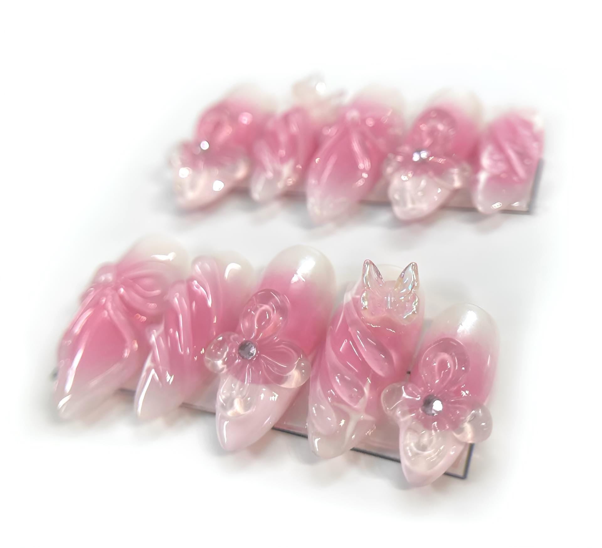 Pink White 3D Bow Flower Press On Nails Elegant False Nails Rhinestone Accent Glue On Girly Spring Nail Set
